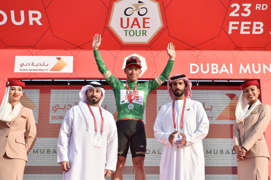 Jebel Hafeet, 25 de febrero de 2020 : Adam Yates ganó la Etapa 3, Emirates Stage, de la segunda edición del Tour de los EAU, por delante de Tadej Pogacar y Alexey Lutsenko. Adam Yates es el nuevo líder de la GC y recibió el Jersey Rojo.